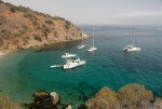 We arrived here at 4th of July Cove at the Isthmus of Catalina. The wind was a bit much for bow and stern anchor \”fire\” drills